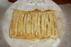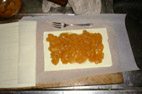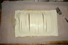 その一枚に4辺から1cmほど離して、たっぷりリンゴジャムを載せる。画像ではびわ煮を載せているビワパイである。もう一枚のパイシートに 右図のように刻みナイフを入れる。